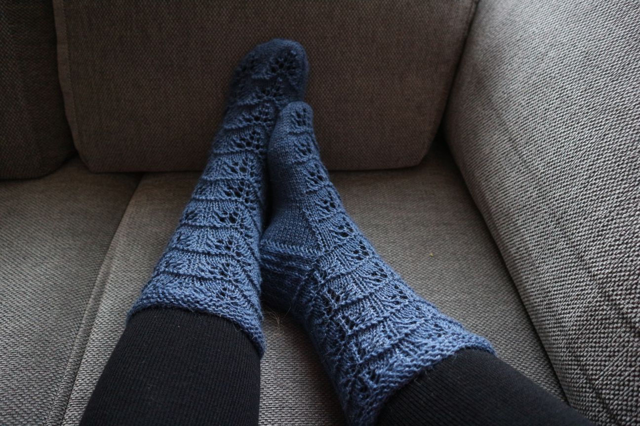 Mallikuvio oli taas helppo oppia ulkoa, mutta harmillisesti onnistuin toisessa sukassa yhdessä vaiheessa kadottamaan kaksi langankiertoa enkä tajua, miten en asiaa huomannut heti vaan purkamista tuli varmaan kymmenkunta kerrosta. Muuten taisin tehdä sukat ihan ohjeen mukaan, mutta kärkikavennukset aloitin heti joka kerroksella. Sovituskuvia: